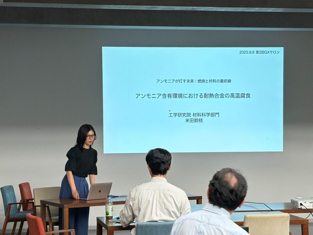 8月6日(木)17時30分よりGXC第2回サロンを開催いたしました。今回はアンモニアをテーマとして設定し、工学研究院 機械・宇宙航空工学部門 橋本望教授、材料科学部門 米田鈴枝准教授から話題提供を行いました。当日は14名の方にご参加頂きました。